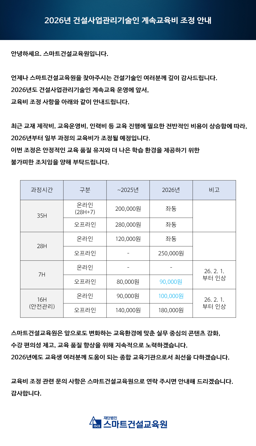 2026년 건설사업관리기술인 계속교육비 조정 안내