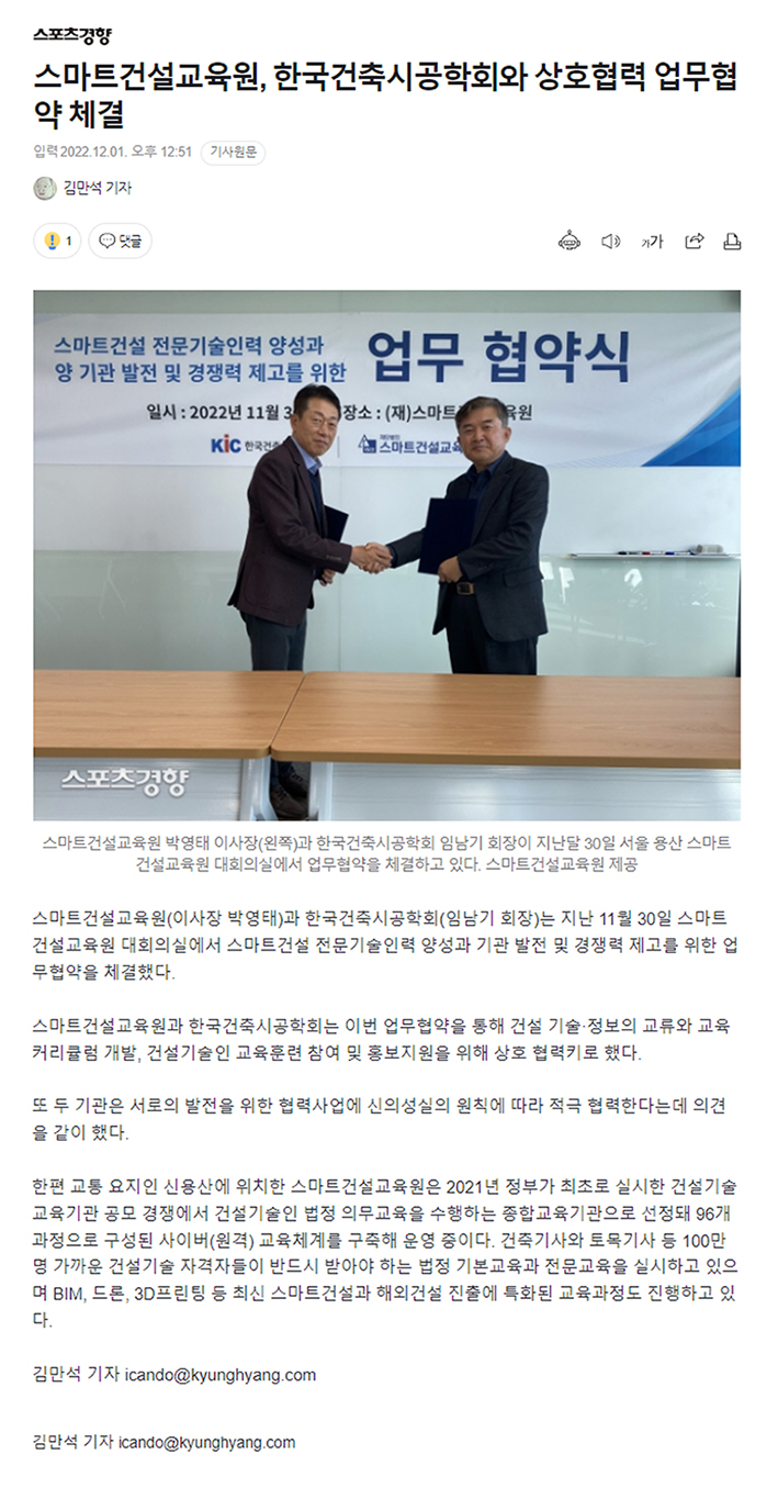 [언론 보도] 스마트건설교육원, 한국건축시공학회와 상호협력 업무협약 체결