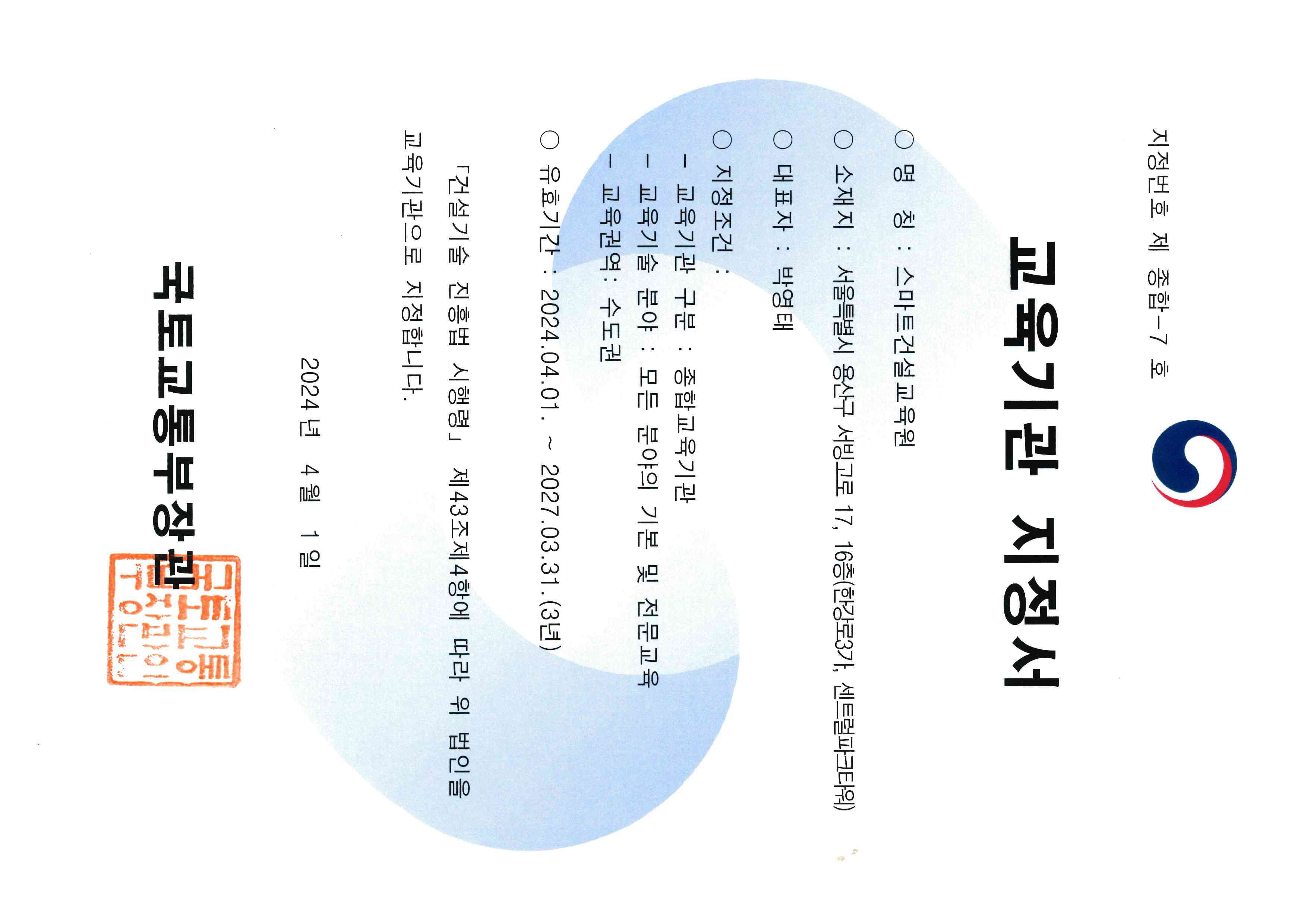 [스마트건설교육원] 교육기관지정서