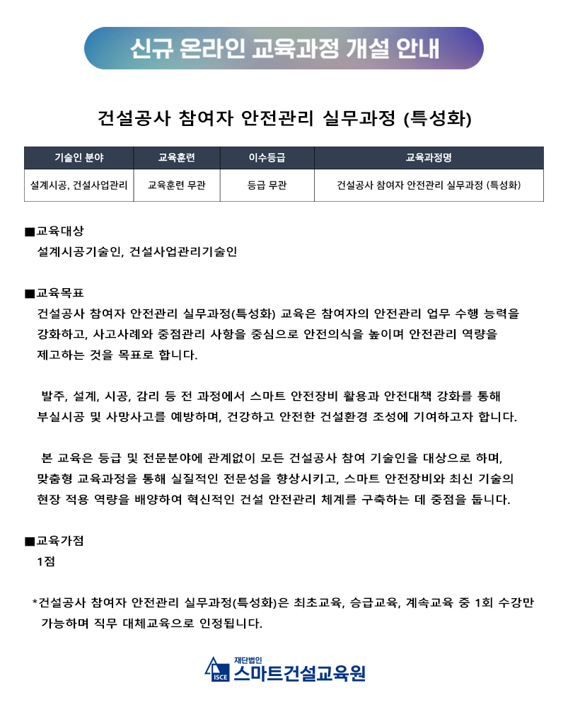 신규 온라인교육과정개설 안내 (특성화 과정(건설공사 참여자의 안전관리 실무))